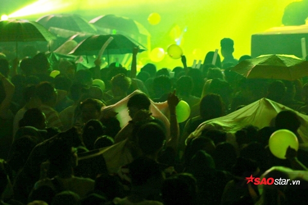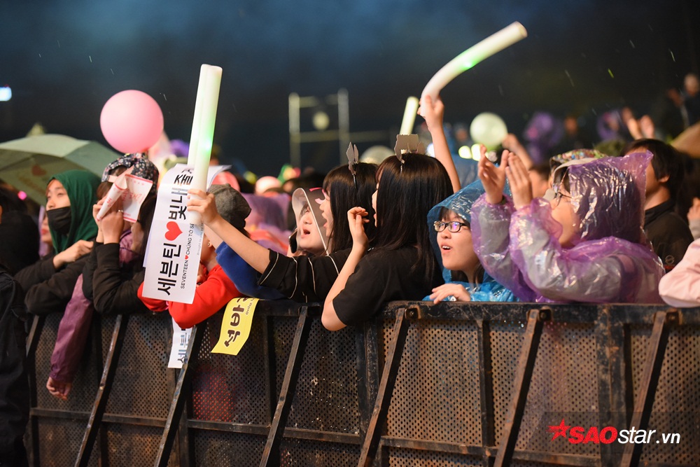 Khi chương trình bắt đầu khoảng 30 phút, trời bắt đầu mưa nặng hạt. Mọi thứ được các fan tận dụng để che chắn.