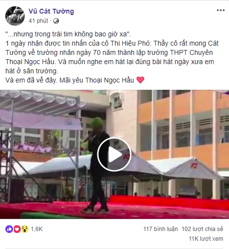 Cách đây ít phút, Vũ Cát Tường bất ngờ đăng tải đoạn clip khiến người hâm mộ chú ý. Cụ thể trong dòng trạng thái của mình, cô chia sẻ một ngày bỗng nhận được tin nhắn của Cô Hiệu Phó của trường THPT mà nữ ca sĩ từng theo học với mong muốn được nghe cô trở về trường hát đúng ca khúc ngày xưa từng hát nhân dịp 70 năm thành lập trường. Và không để cô giáo của mình phải chờ lâu, Vũ Cát Tường đã xuất hiện tại ngôi trường cấp 3 của mình ngân vang những giai điệu đầy thơ mộng trong ca khúc Quê hương tuổi thơ tôi.