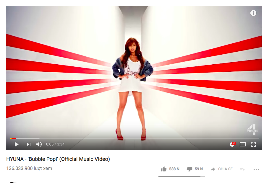Cái thời khi dòng nhạc EDM điện tử ở Hàn Quốc còn chưa phổ biến, đã có một idol nữ mở màn với một ca khúc đưa thể loại âm nhạc này vào thị trường K-Pop và từ đó trở thành xu hướng mới của ngành công nghiệp âm nhạc xứ Kim chi. Sau 4 năm phát hành, MV của ca khúc đã chính thức đạt mốc 100 triệu lượt xem, giúp cô nàng trở thành idol nữ đầu tiên làm được điều đó. Và không ai khác đó chính là biểu tượng quyến rũ của K-Pop: Kim Hyuna với ca khúc Bubble Pop.