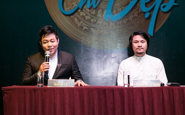 Quang Lê và đạo diễn Hoàng Nhật Nam trong buổi họp báo giới thiệu liveshow Hát trên quê hương 5 hồi tháng trước.
