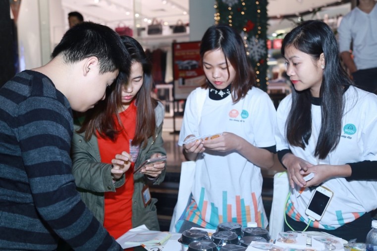Các bạn trẻ được hướng dẫn cài và sử dụng ứng dụng MOOV ngay tại chỗ.