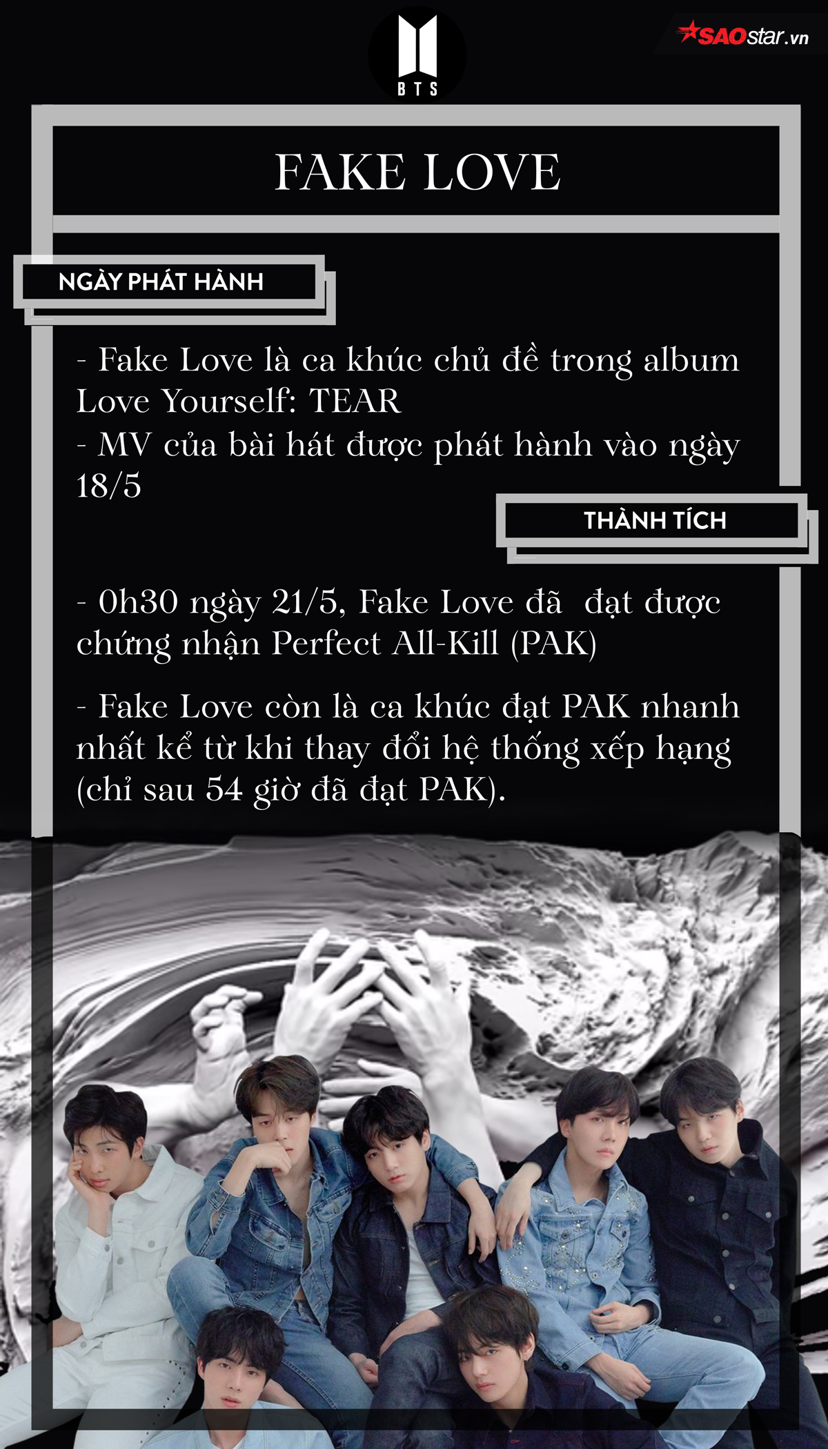 Fake Love không chỉ giúp BTS đạt PAK đầu tiên trong sự nghiệp mà còn là ca khúc đạt PAK nhanh nhất kể từ khi thay đổi hệ thống bảng xếp hạng (chỉ sau 54 giờ). Với thành tích này, BTS đã chứng minh cho công chúng thấy nhóm không chỉ là “ông hoàng bán đĩa” mà còn ngày càng trở nên đáng gờm ở mảng nhạc số.
