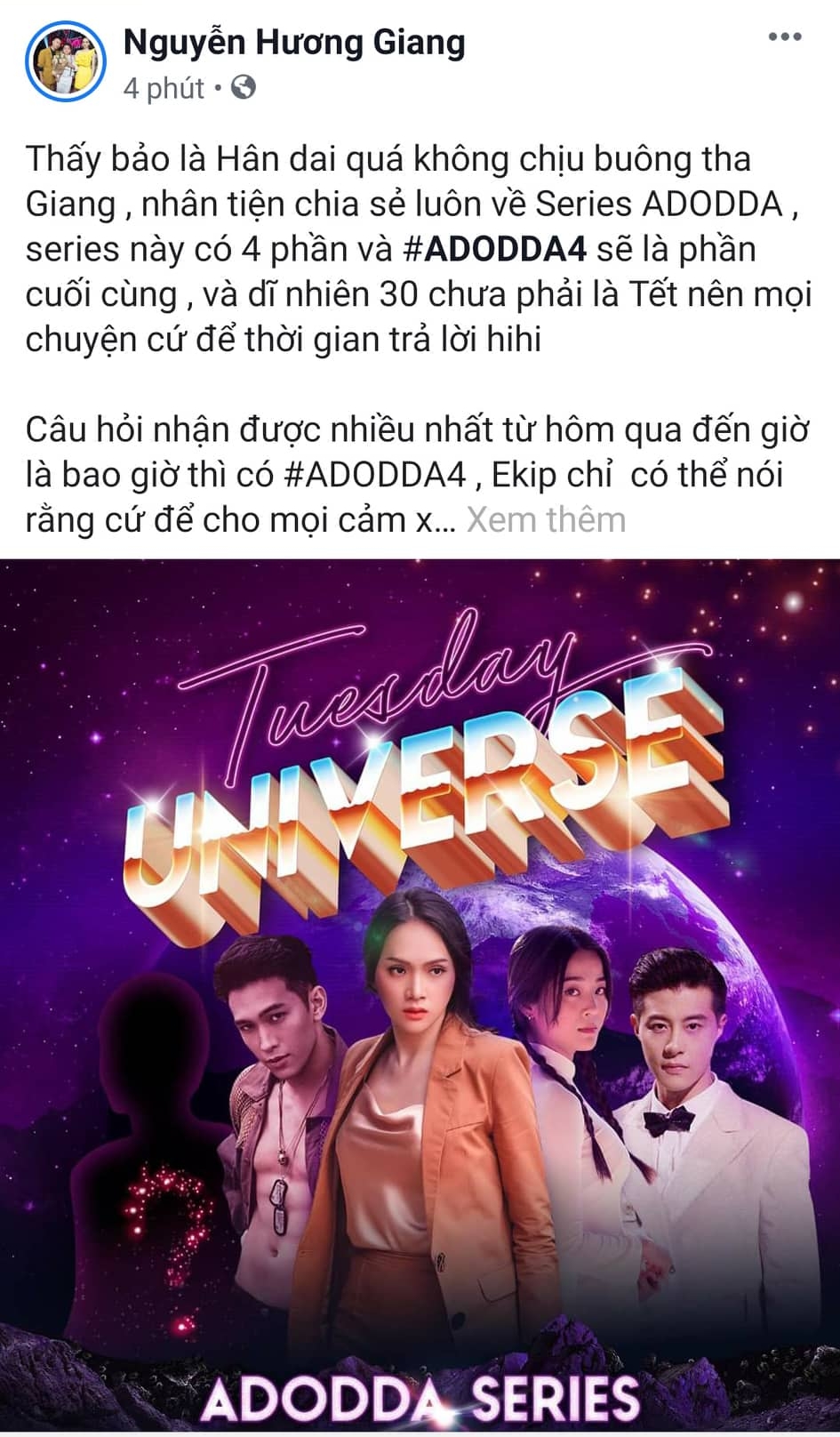 Hương Giang mới đây tiếp tục khiến khán giả và người hâm mộ vô cùng tò mò khi tung ra những hình ảnh tiếp theo cho vũ trụ Tuesday. Theo đó, Hương Giang cho biết vì mọi người phản hồi quá nhiều về việc Hân “sống dai” quá nên quyết định bật mí #ADODDA4 sẽ là phần cuối cùng của chuỗi series này. Tuy nhiên điều khiến khán giả quan tâm nhất chính là việc ngoài 4 nhân vật chủ chốt thì ở phần cuối này sẽ có sự xuất hiện của một bóng đen bí ẩn. Chưa rõ bóng đen này là ai và sẽ tham gia Vũ trụ Tuesday với tư cách gì, nhưng chắc chắn một điều rằng đây sẽ là nhân vật quan trọng tạo nên cú plot twist ấn tượng cho series này để có thể tiếp tục #1 trending.