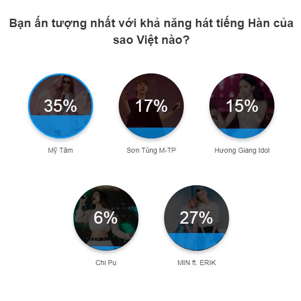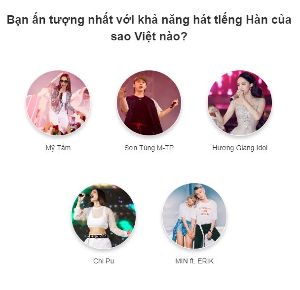 Trước Soobin, không ít nghệ sĩ Việt cũng đã có những phần trình diễn bằng tiếng Hàn đặc sắc khiến người hâm mộ thích thú. Vì vậy, SAOstar đã thực hiện một cuộc bình chọn nghệ sĩ Việt hát tiếng Hàn được khán giả yêu thích nhất với những gương mặt đình đám sau: