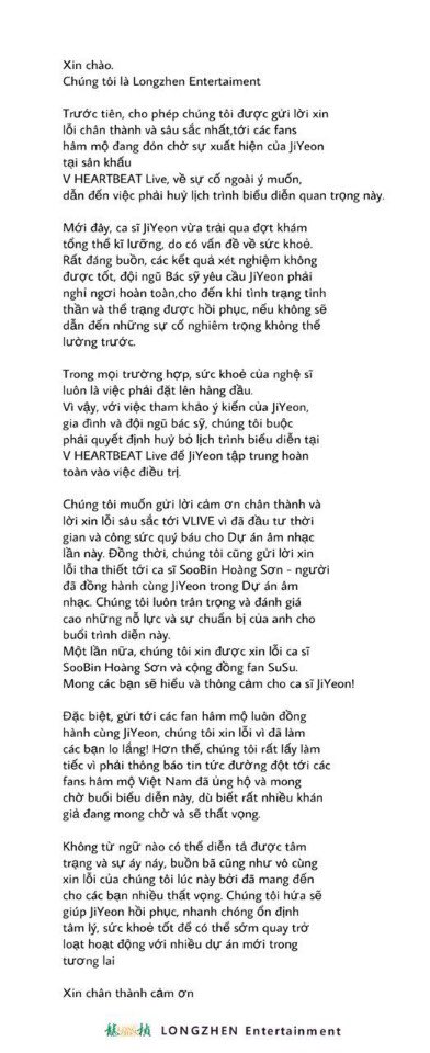 Trong thư, Jiyeon muốn gửi lời xin lỗi với V-Queen's, em út T-ara hứa sẽ tái ngộ khán giả Việt Nam ngay khi có thể. Chưa hết, cô nàng còn xin lỗi Soobin - người đã đồng hành, giúp đỡ Jiyeon trong suốt quá trình thực hiện dự án hợp tác.