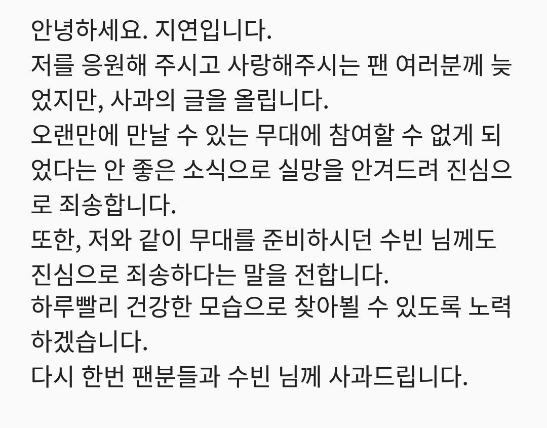 Hủy show không phải là một chuyện hay, có thể ảnh hưởng lớn tới hình ảnh của nghệ sĩ nhưng với câu xin lỗi chân thành từ Jiyeon thì cô nàng vẫn rất đáng được tha thứ.