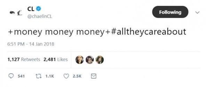 Đầu năm nay, CL cũng gây xôn xao dư luận với dòng tweet đầy ẩn ý: “Họ chỉ quan tâm đến tiền.“