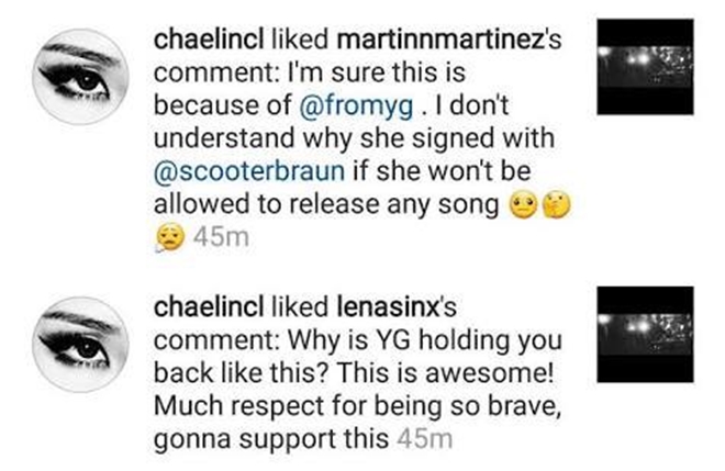 Vài tháng trước, fan cũng phát hiện cô nàng nhấn like những bình luận trách móc YG khi cho CL “đóng băng hoạt động” quá lâu.
