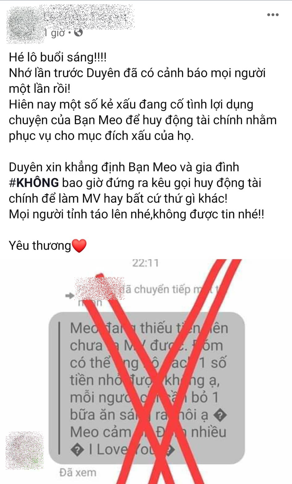 Tuy nhiên ngay sau đó, trưởng FC của Jack đã nhanh chóng đưa ra thông tin đính chính về đoạn tin nhắn đang được lan truyền. Theo đó, người này khẳng định: “… Hiện nay một số kẻ xấu đang cố tình lợi dụng chuyện của bạn Meo để huy động tài chính nhằm phục vụ cho mục đích xấu của họ. Mình xin khẳng định bạn Meo và gia đình không bao giờ đứng ra kêu gọi, huy động tài chính để làm MV hay bất cứ thứ gì khác“.