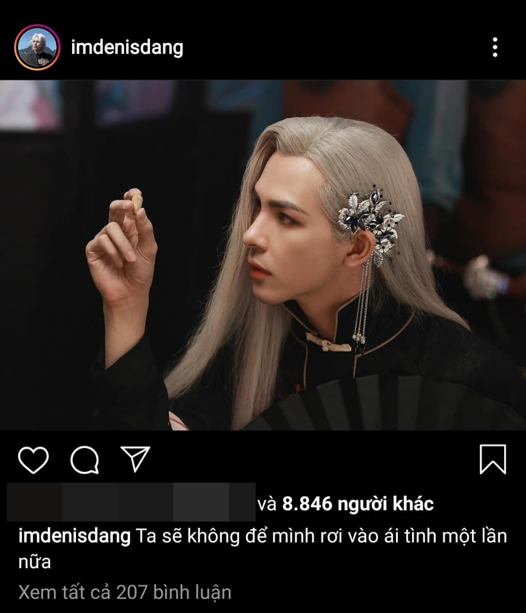 Thế nhưng mới đây, cộng đồng người hâm mộ Nguyễn Trần Trung Quân đã đứng ngồi không yên trước một bài đăng từ Denis Đặng. Cụ thể, Denis đã đăng tải bức ảnh với tạo hình cổ trang vô cùng bắt mắt, đi cùng là dòng caption cực gây tò mò: "Ta sẽ không để mình rơi vào ái tình một lần nữa".