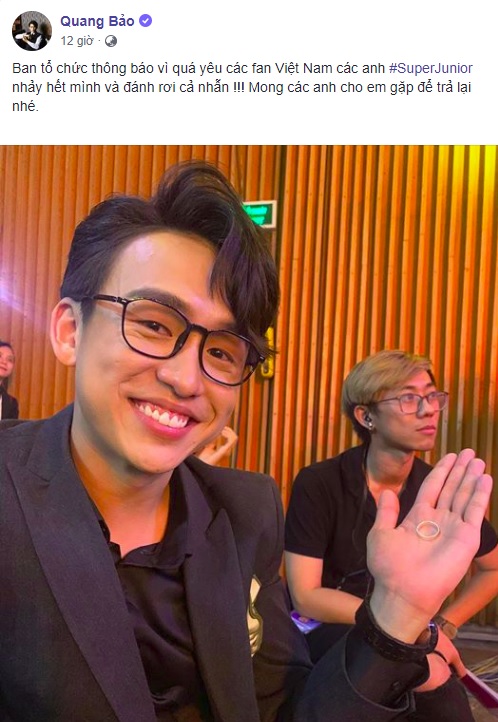 Và có lẽ vì quá cuồng nhiệt với khán giả, Super Junior đã nhảy vô cùng nhiệt tình mà… đánh rơi mất cả nhẫn. Cụ thể, trên trang cá nhân của Quang Bảo - MC đêm nhạc tối qua, anh chàng đã chia sẻ về việc đã nhặt được chiếc nhẫn bị đánh rơi và nói đùa rằng mong được gặp lại Super Junior để trả lại. Ngay lập tức rất đông fan của nhóm nhạc cũng đã vào bình luận bày tỏ sự tiếc nuối khi thần tượng mình lỡ đánh rơi mất đồ. Tuy nhiên, MC Quang Bảo cũng đã lên tiếng về việc chiếc nhẫn đã được trao trả lại phía BTC để có thể gửi lại Super Junior một cách nhanh nhất có thể.