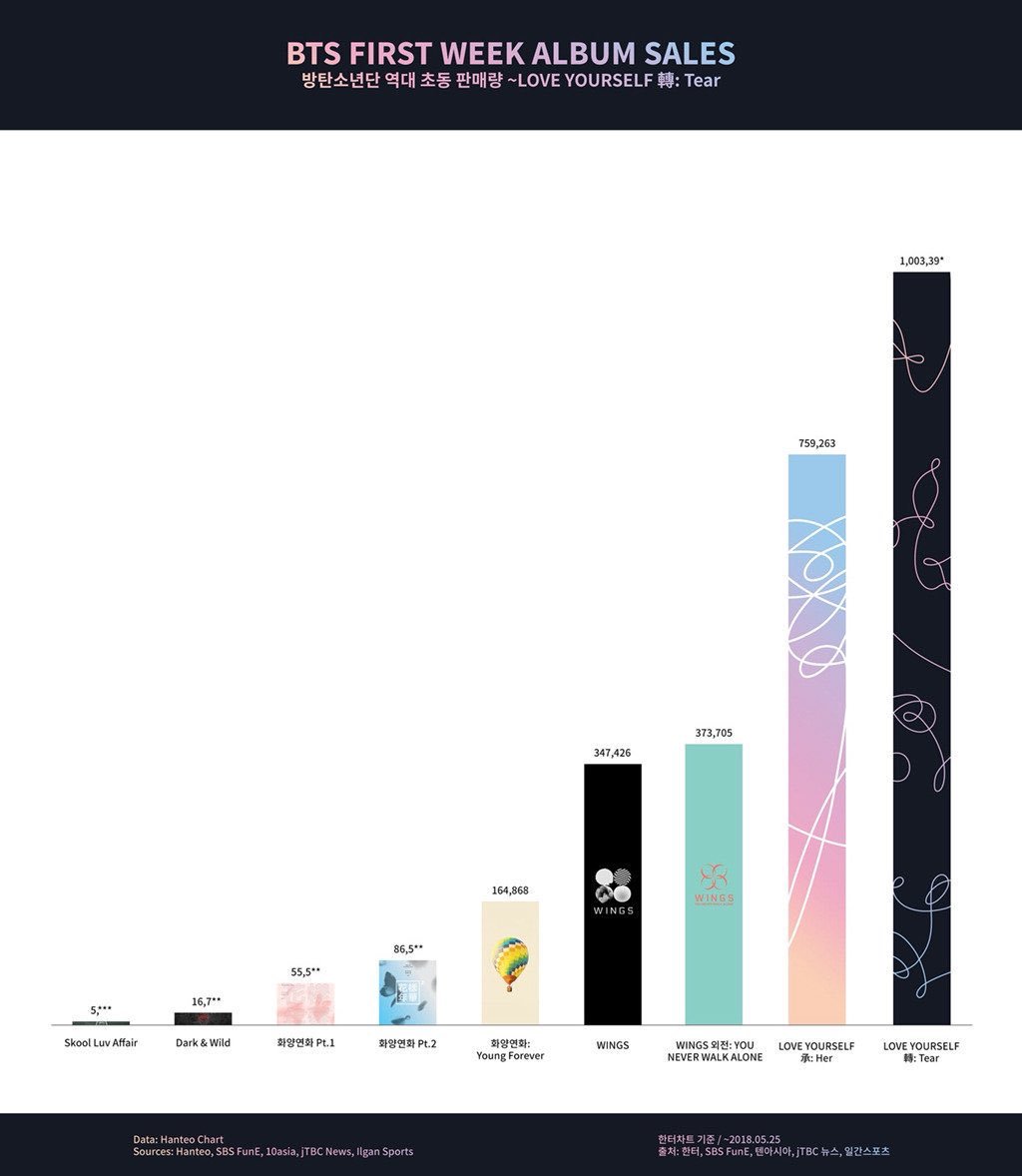 Qua bảng tổng hợp trên, có thể thấy các cột biểu đồ đang đi lên ngày một cao hơn và chắc chắn sẽ còn tăng nhanh nữa trong tương lai. Năm 2014, album Skool Luv Affair chỉ bán được hơn 5000 bản trong tuần đầu tiên. Và với Love Yourself: Tear, BTS chỉ cần 1 tuần (từ 18h chiều ngày 18/5 đến 24/5) để tạo lập nên lịch sử với hơn 1 triệu bản tiêu thụ được theo ghi nhận của Hanteo. Trước BTS, chưa một nhóm nhạc hay nghệ sĩ Hàn Quốc nào từng chạm tới con số này.