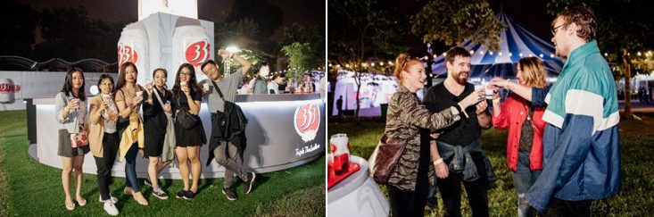 Không chỉ tạo nên một địa điểm check-in thú vị, quầy bar của Bia 333 còn phục vụ bia miễn phí, tạo cho người xem có cảm giác đang ở trong một bữa tiệc ngoài trời thực sự. Hương vị thơm mát đặc trưng của vị bia trăm tuổi, hòa cùng âm nhạc đặc sắc đã tạo nên sự kết hợp khó phai trong lòng người tham dự.