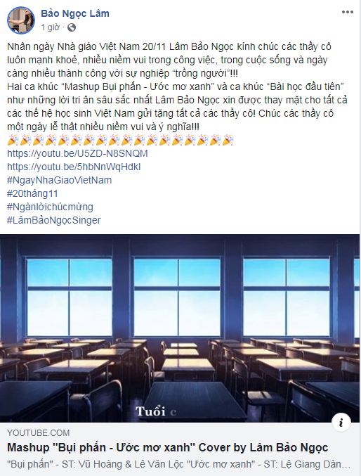 20/11, thời điểm mà tất cả các bạn học sinh đang cùng nhau nô nức chuẩn bị các “hình thức” để tri ân thầy cô của mình. Không riêng gì các bạn học sinh, ngay cả những nghệ sĩ, ca sĩ nổi tiếng cũng nhân dịp này đã bày tỏ sự kính trọng của mình dành cho thầy cô thông qua các món quà vô cùng đặc biệt. Mới đây, cô gái trưởng thành từ Giọng hát Việt 2019 - Lâm Bảo Ngọc đã thực hiện một bản mashup Bụi phấn - Ước mơ xanh, như là một lời cảm ơn chân thành đến những người từng giáo dục mình trên ghế nhà trường.