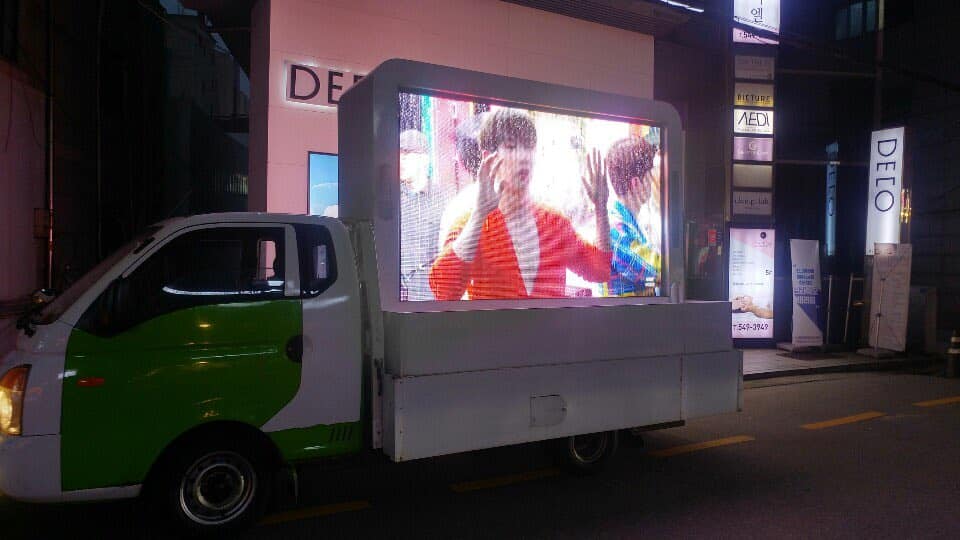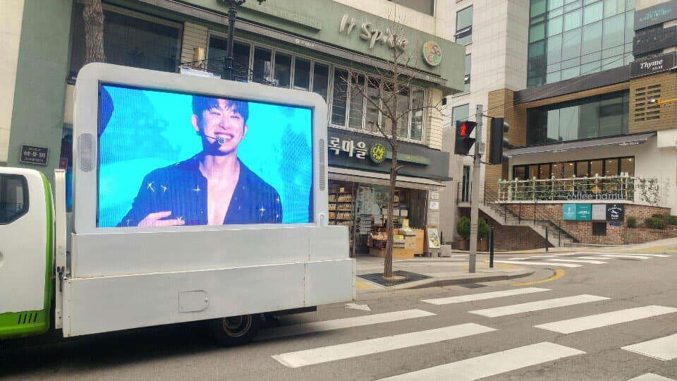 Xe mang bảng LED chúc mừng sinh nhật Wonho chạy xung quanh Starship Entertainment.