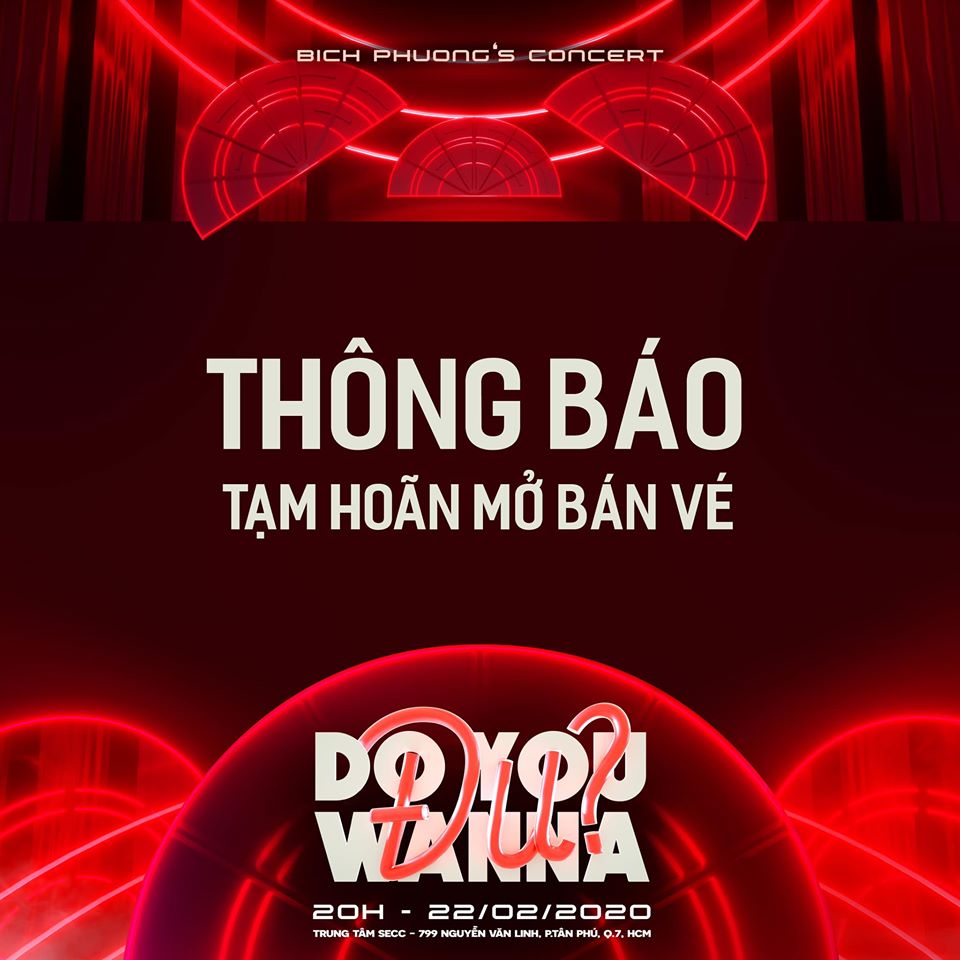 Bích Phương's Concert: Do you wanna đu là concert đầu tiên của Bích Phương, được cô ấp ủ từ rất lâu, dự kiến diễn ra vào đêm 22/2/2020 và bắt đầu mở bán vé vào ngày 31/1/2020. Tuy nhiên, trước những diễn biến phức tạp của dịch bệnh, nữ ca sĩ đã phải đưa ra quyết định vì muốn đảm bảo sức khỏe cho những khán giả đã yêu thương mình. Bích Phương buồn bã livestream thông báo tạm hoãn mở bán vé và sau đó là hoãn luôn concert.