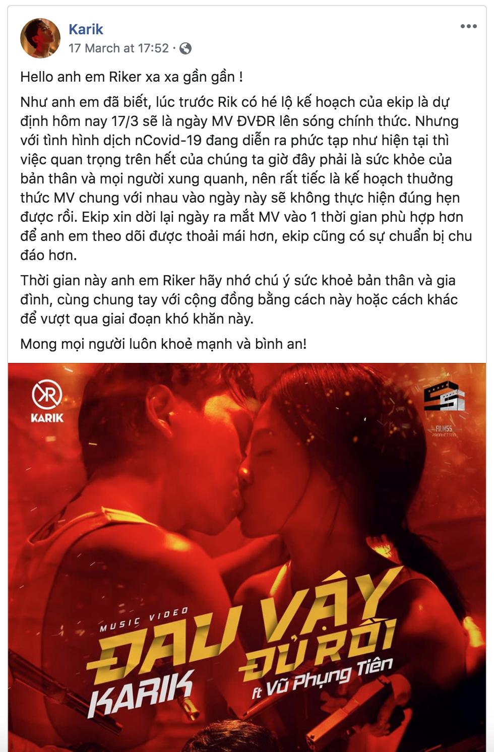 Tối 17/3, Karik đăng tải hình ảnh poster MV mới mang tên Đau vậy đủ rồi. Tuy nhiên, đây lại là một bài viết thông báo sẽ dời lịch ra mắt MV với lí do dịch bệnh Covid-19 đang hoành hành: “Ekip xin dời lại ngày ra mắt MV vào 1 thời gian phù hợp hơn để anh em theo dõi được thoải mái hơn, ekip cũng có sự chuẩn bị chu đáo hơn. Thời gian này anh em Riker hãy nhớ chú ý sức khoẻ bản thân và gia đình, cùng chung tay với cộng đồng bằng cách này hoặc cách khác để vượt qua giai đoạn khó khăn này”. Khá nhọ cho Karik và các fan khi sản phẩm ra mắt ngay tâm điểm dịch bệnh bùng phát trở lại khiến anh chàng phải hoãn kế hoạch vào ngay phút chót trước khi MV lên sóng.