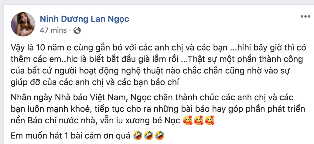 Sáng ngày 21/6, nhân ngày Báo chí Cách Mạng Việt Nam hàng năm, các nghệ sĩ cùng nhau gửi những lời tri ân và lời chúc tốt đẹp đến những ngòi bút đã góp phần đưa họ đến gần hơn với khán giả. Là một trong những người chúc sớm nhất và đây cũng là năm thứ 10 vào nghề của Ninh Dương Lan Ngọc, cô nàng dành lời chúc có tâm và cảm ơn chân thành: “Vậy là 10 năm em cùng gắn bó với các anh chị và các bạn… hihi bây giờ thì có thêm các em… hic là biết bắt đầu già lắm rồi… Thật sự một phần thành công của bất cứ người hoạt động nghệ thuật nào chắc chắn cũng nhờ vào sự giúp đỡ của các anh chị và các bạn báo chí. Nhân ngày Nhà báo Việt Nam, Ngọc chân thành chúc các anh chị và các bạn luôn mạnh khoẻ, tiếp tục cho ra những bài báo hay góp phần phát triển nền Báo chí nước nhà, vẫn iu xương bé Nọc”.