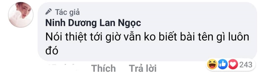 Thậm chí ngay cả bản thân Ninh Dương Lan Ngọc cũng thừa nhận rằng không biết mình đang hát bài gì, ngay dưới phần bình luận của bài đăng nữ diễn viên đã cho biết. Có thể thấy rằng mặc dù đã lên kịch bản khá chỉn chu, chi tiết từ những ngày đầu nhận thiệp cưới, nhưng cuối cùng đâu lại vào đấy, Ninh Dương Lan Ngọc tiếp tục thể hiện khả năng làm… “biến chất hit” của mình.