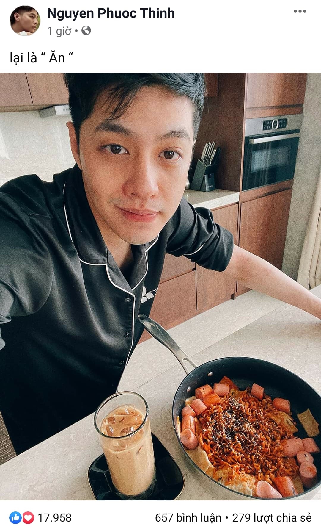 Mới đây, Noo Phước Thịnh tiếp tục khiến cộng đồng người hâm mộ của mình vô cùng thích thú khi khoe thành quả nấu nướng trên trang cá nhân. Cụ thể, Noo Phước Thịnh xuất hiện trong bộ đồ ngủ mặc nhà hết sức giản dị, bên cạnh đó là một chảo mì xào trông rất gì và này nọ: “Lại là ăn“. Dường như Noo Phước Thịnh đã cảm thấy rất tự hào về thành quả nấu nướng của mình nên quyết định selfie “sương sương” để khoe với người hâm mộ.
