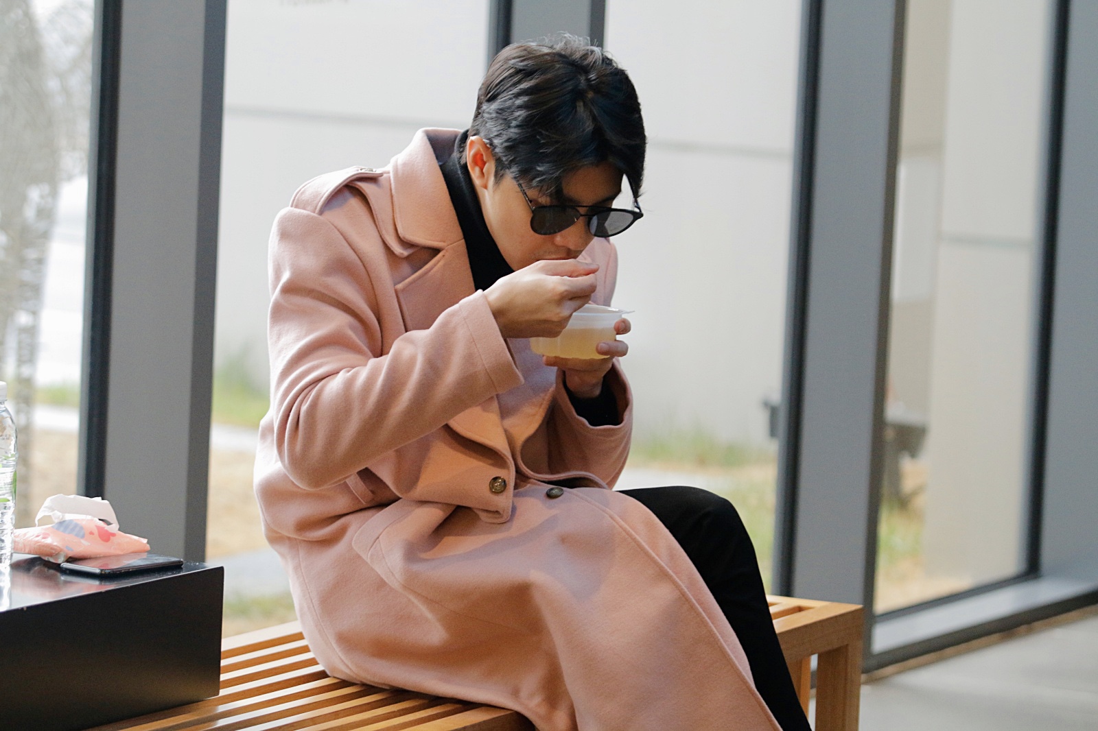 Noo Phước Thịnh ăn vội sau khi đáp chuyến xuống sân bay Hàn Quốc.