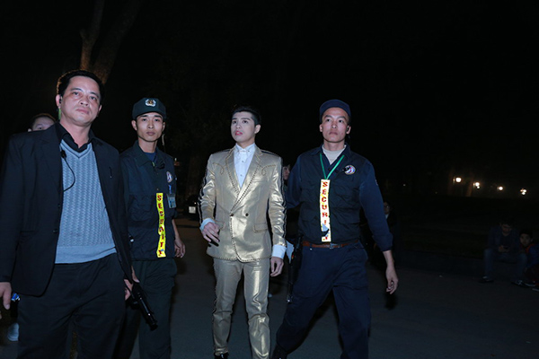 Noo Phước Thịnh được vệ sĩ hộ tống vào bên trong cánh gà.