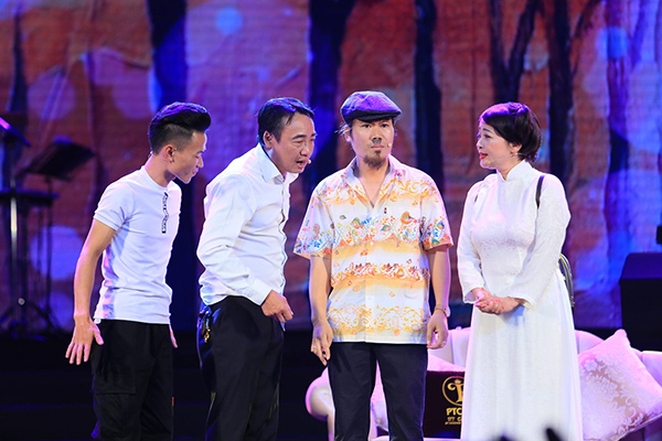 Nghệ sĩ hài Vượng Râu và nghệ sĩ Trà My (phải) tham gia một hoạt cảnh để minh họa cho những ca khúc Nỗi buồn hoa phượng, Áo em chưa mặc một lần, Thành phố buồn của Hồ Quang 8.