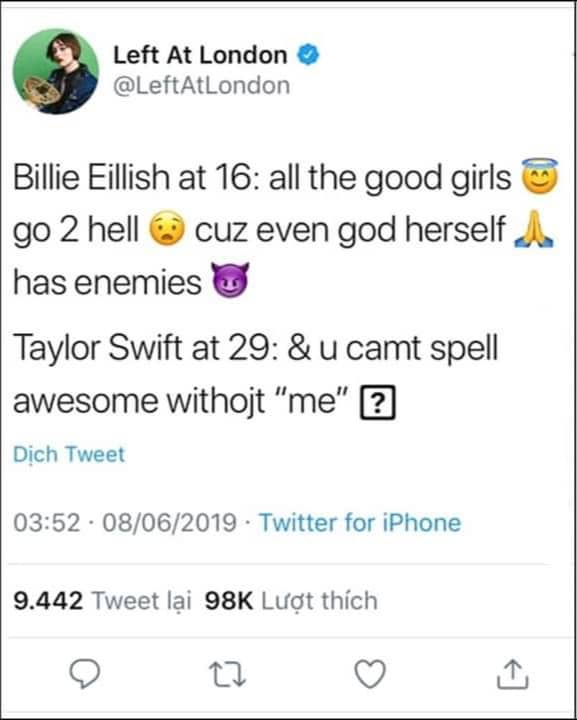 Chưa dừng lại ở đó, cô nàng tiếp tục tỏ vẻ ngông cuồng khi so sánh Taylor Swift với Billie Eilish, mà cụ thể thì hàm ý của cô ta là việc Billie chỉ mới 16 tuổi nhưng âm nhạc của cô ấy thật sự trưởng thành còn Taylor đã 29 tuổi nhưng vẫn chưa thể… đánh vần được chữ ME. Xem ra cô nàng này khá thông thái khi đưa ra những nhận định “trên trời rớt xuống” như thế này.