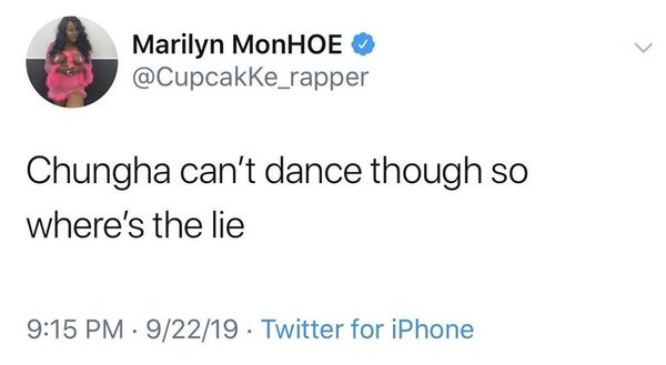 Cụ thể, vào ngày 22/9, CupcakKe đã bất ngờ chia sẻ lại một đoạn video ghi lại cảnh Chungha đang tập vũ đạo kèm với những lời lẽ chê bai hết sức kém duyên: “Cái này mà gọi là nhảy đây sao? Bọn họ không thể nhảy được đâu. Nhìn tư thế của họ đi, cứ như lúc chuẩn bị đi vệ sinh vậy”. Phát ngôn của CupcakKe sau đó đã nhận về hàng tá chỉ trích từ người hâm mộ của Chungha, ai cũng tỏ ra bất bình vì nữ idol Kpop chưa hề đá động gì tới cô nàng thích gây sự kia. Chưa kể, Chungha hiện tại đang được đánh giá là một trong những nữ ca sĩ solo có thực lực nhất tại Kpop ở thời điểm hiện tại.