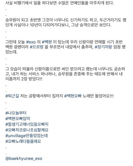 Gần đây, bài đăng của một nữ tiếp viên hàng không trên Instagram cá nhân về anh chàng Baekhyun (EXO) đã trở thành chủ đề bàn tán của cư dân mạng. Bài đăng của cô nàng gây chú ý với hashtag #I'm a fan of Beakhyun from today (Tạm dịch: Tôi là fan của Beakhyun kể từ hôm nay. Nữ tiếp viên hàng không đã chia sẻ tính cách thật sự của Baekhyun khi cô nàng phục vụ trên chuyến bay ấy. Cô ấy chia sẻ rằng với tính chất công việc của mình, việc thường xuyên gặp các thần tượng là điều bình thường. Nhưng cho đến khi cô gặp Baekhyun, điều ấy lại trở nên vô cùng đặc biệt.