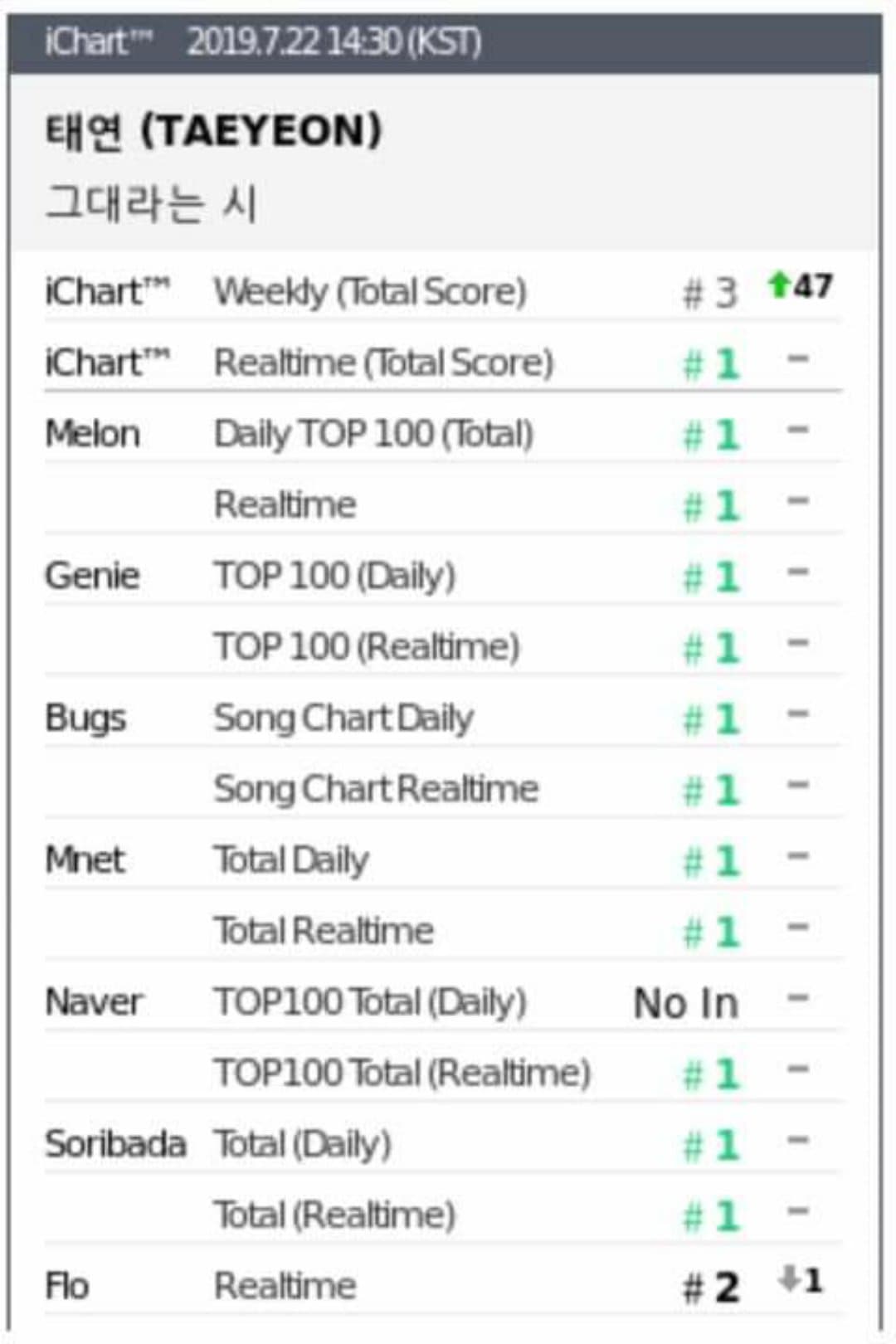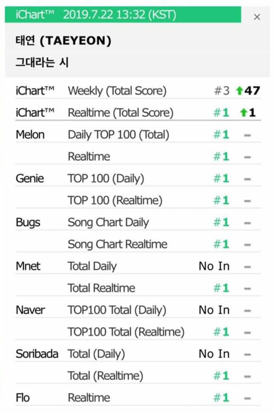 Cụ thể, rạng sáng ngày 22/7 A Poem Titled You đã đạt Allkill trên tất cả 6 trang nhạc lớn là Bugs, Genie, Naver, Soribada, Melon và Flo. Hiện tại, ca khúc vẫn chưa chịu nhường ngôi cho các đối thủ khác, cập nhật vào 13h32 trưa ngày 22/7 A Poem Titled You vẫn chiếm sóng trên các BXH này. Tuy nhiên mới đây, ca khúc đã bị tuột hạng nhẹ trên hệ thống FLO chart, tuy nhiên ở những BXH khác thì Taeyeon vẫn xưng vương.