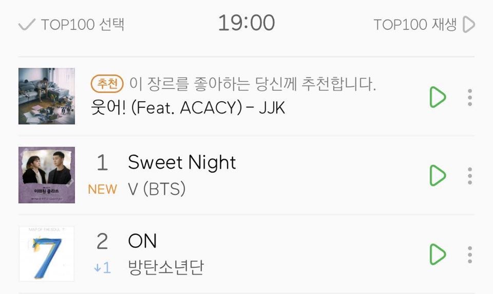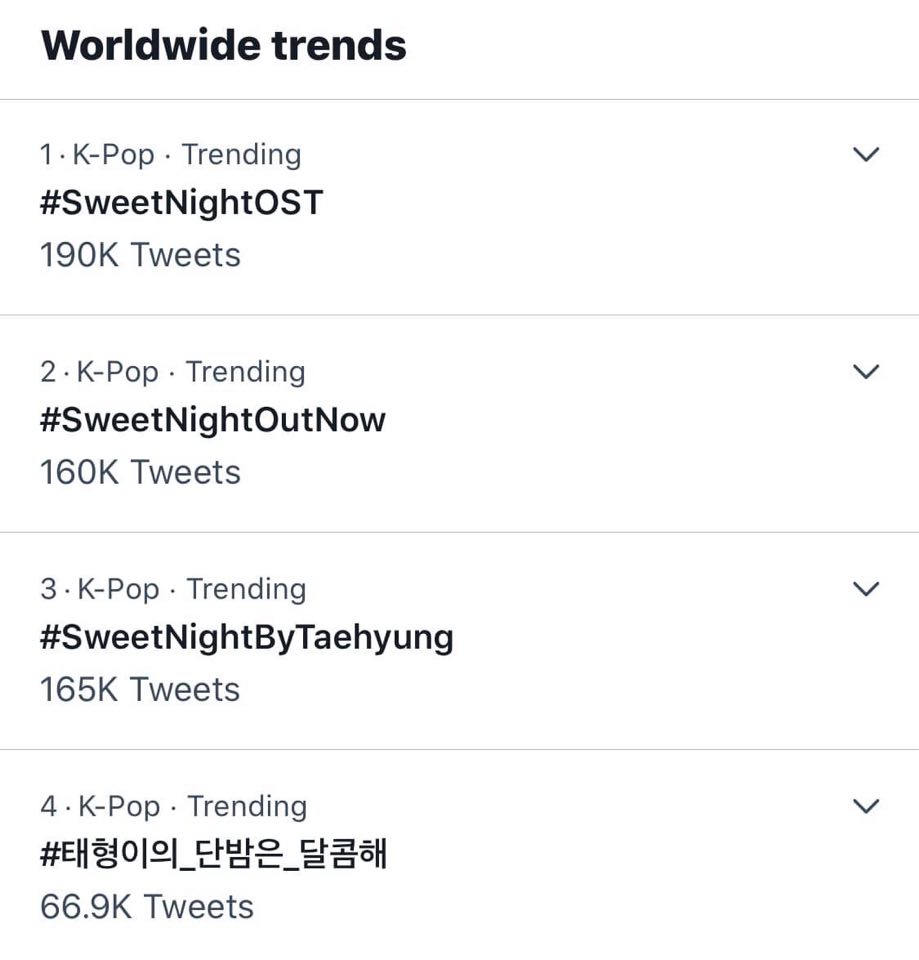 Ngay khi vừa phát hành, các hashtag về Sweet Night đã nhanh chóng đứng đầu Top Trending Toàn cầu, điều này đã phần nào thể hiện sức hút của V cũng như sự ủng hộ mạnh mẽ từ các fan hâm mộ. Không dừng lại ở đó, ARMY lại tiếp tục chứng kiến 1 tình huống “dở khóc dở cười” khác khi ca khúc chính thức vượt mặt BTS để đứng đầu BXH MelOn. Kể từ khi phát hành, đây là lần đầu tiên ON của BTS rời khỏi vị trí thứ nhất trên BXH này và người “đánh bại” lại chẳng phải ai khác mà chính là V - 1 thành viên trong nhóm. Đặc biệt hơn, sau ON đây là bài hát thứ 2 trong năm 2020 có thành tích ra mắt No.1 tren BXH của MelOn. Sweet Night cũng là ca khúc OST duy nhất có thành tích ra mắt ấn tượng đến vậy.