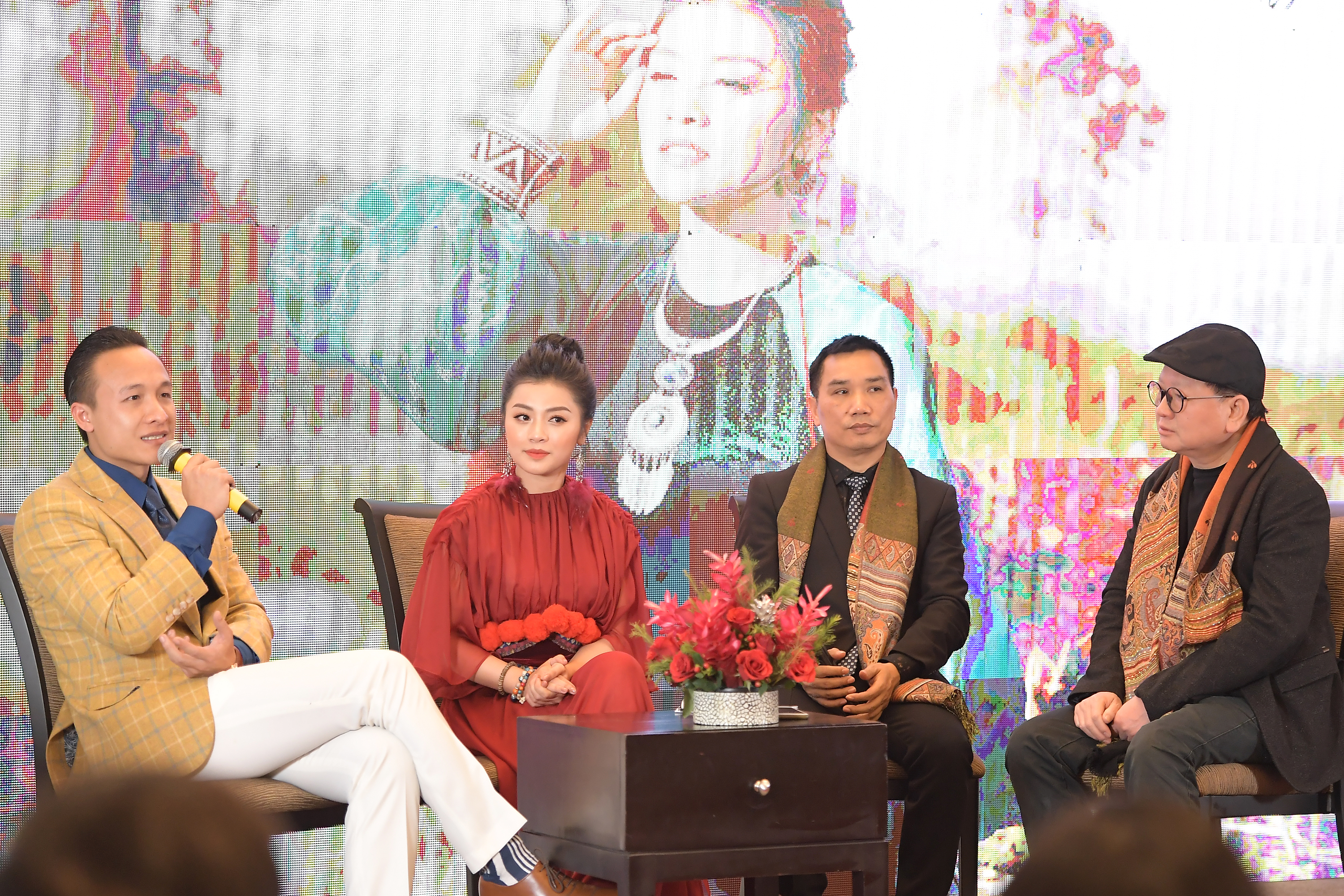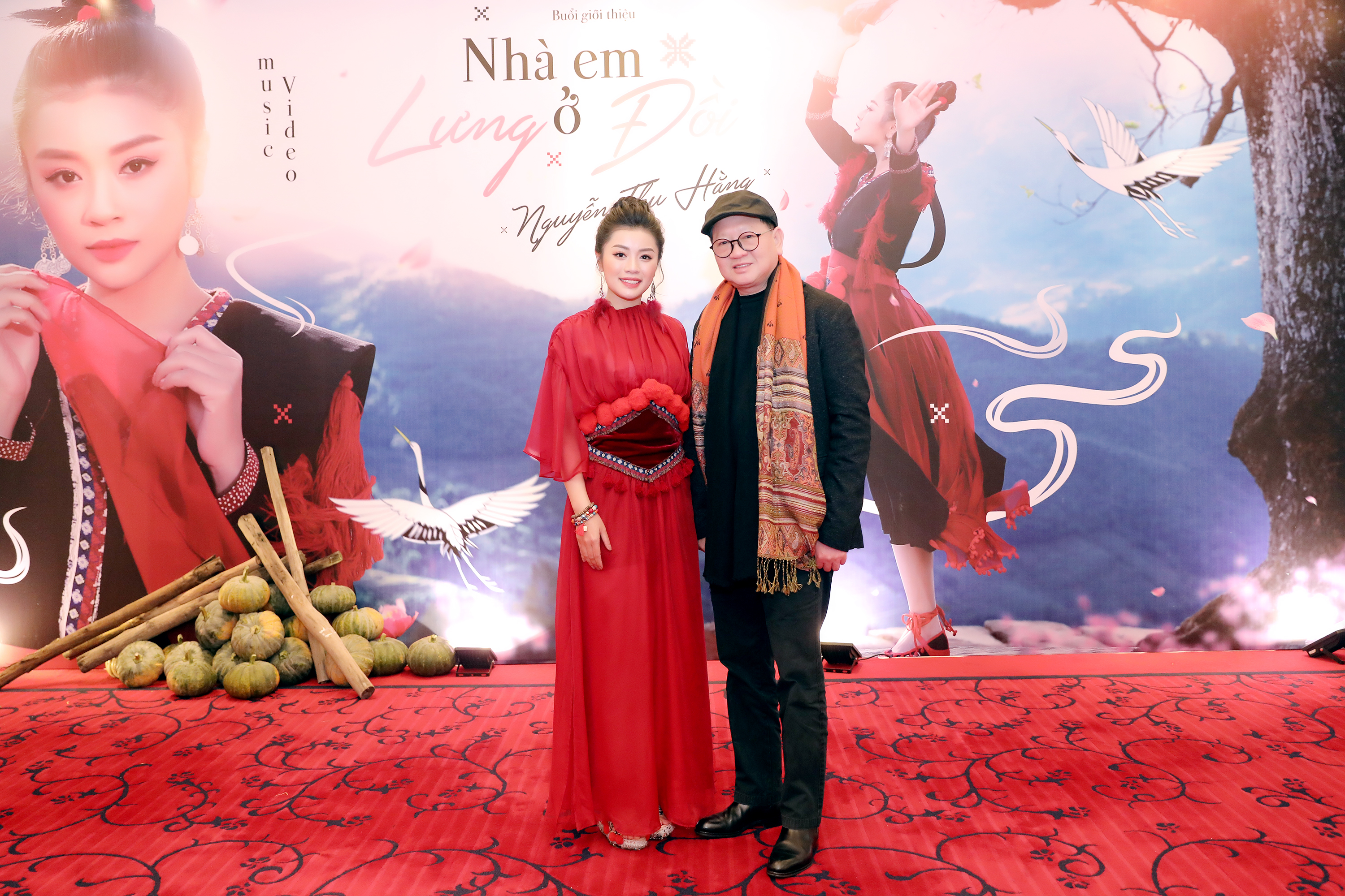 Thu Hằng và nhạc sĩ Đức Trịnh trong buổi họp báo ra mắt MV. Ảnh: Hoà Nguyễn