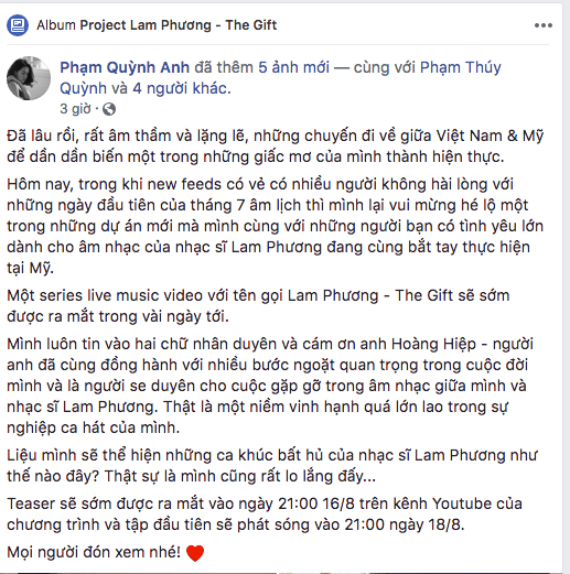 Mới đây trên trang cá nhân, nữ ca sĩ Phạm Quỳnh Anh bất ngờ chia sẻ về sự kết hợp đặc biệt cùng ca sĩ Hoàng Hiệp. Theo đó, cả hai sẽ bắt tay thực hiện một series live music video với tên gọi Lam Phương - The Gift, phát vào tối thứ 7 hàng tuần trên YouTube bắt đầu từ ngày 18/8.