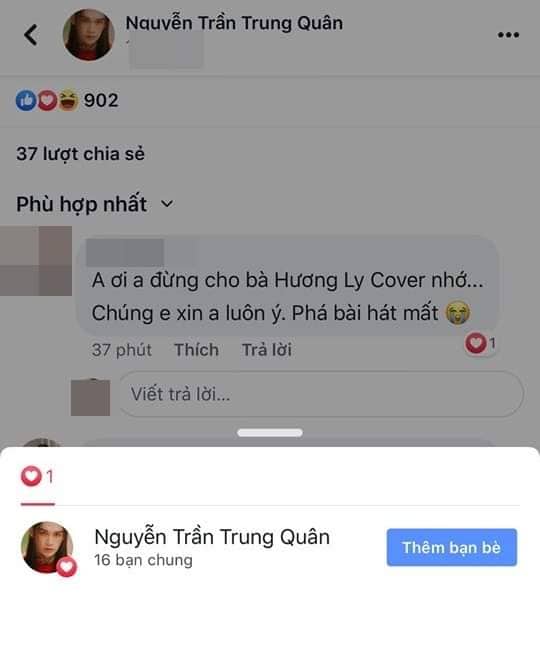 Fan nài nỉ đừng để Hương Ly cover, Nguyễn Trần Trung Quân thả tim yêu thích.