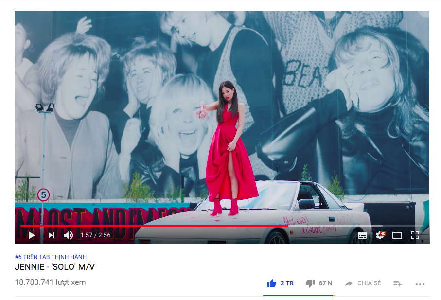 Thêm nữa, sau 1 ngày 5 giờ 35 phút ra mắt MV, SOLO của Jennie đã chạm mốc 2 triệu like trên Youtube. Trở thành MV đạt 2 triệu lượt thích nhanh thứ 2 trong các nghệ sĩ nữ của K-Pop, chỉ sau Ddu-du-ddu-du của BLACKPINK. Thời gian SOLO đạt được con số này nhanh hơn rất nhiều so với những MV 2 triệu like của TWICE ở thời điểm hiện tại. Nhiều người đùa rằng, dù chỉ một thân một mình, cô nàng vẫn có thể “cân” được cả 9 thành viên của TWICE, chứng minh sức ảnh hưởng của Jennie trên toàn thế giới quả là chuyện không thể đùa.