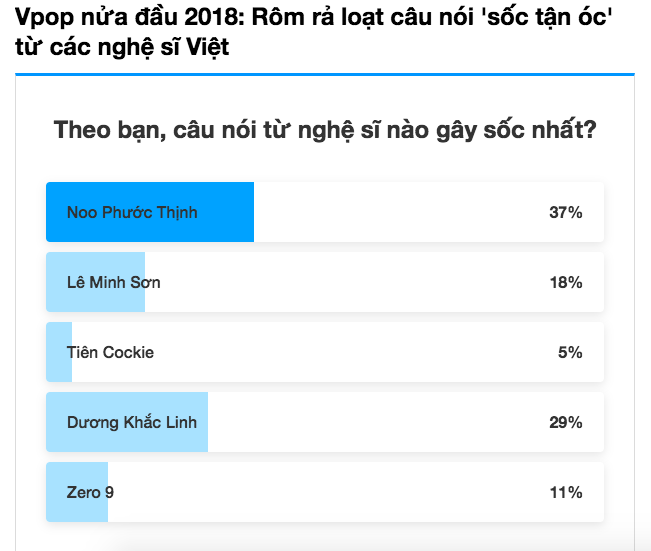 Sau khi bài viết Vpop nửa đầu 2018: Rôm rả loạt câu nói 'sốc tận óc' từ các nghệ sĩ Việt của Saostar lên sóng, rất nhiều độc giả đã quan tâm cũng như bình chọn câu nói của nghệ sĩ nào gây sốc nhất nửa đầu năm. Và trước những phát ngôn gây tranh cãi từ nhạc sĩ Lê Minh Sơn, nhà sản xuất Dương Khắc Linh, Zero 9,… Noo Phước Thịnh cùng câu nói: “Về hát và nhảy vào lúc này thì tôi là nhất” với 37% lượt bình chọn đã trở thành câu nói sốc nhất nửa đầu năm 2018 do độc giả Saostar lựa chọn.