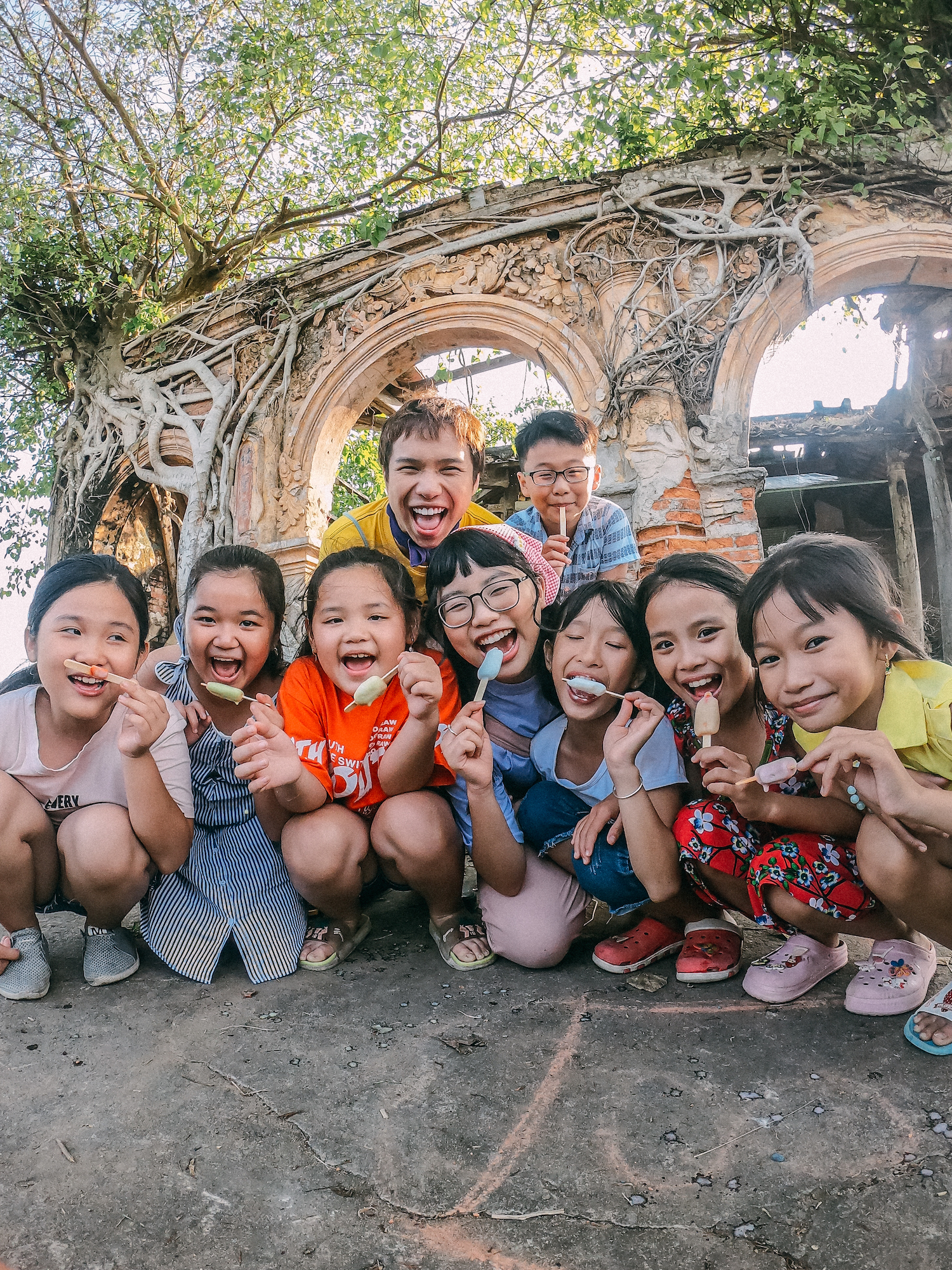 Bên cạnh đó, khi quay cảnh các trò chơi dân gian ở một ngôi đình, em phải đi chân đất. Vô tình trong lúc quay em giẫm phải điếu thuốc lá còn cháy dở và bị phỏng một chút ở chân. Tuy vết bỏng nhỏ thôi nhưng cả đoàn ai cũng sốt sắng lo cho em hết. Em thấy hạnh phúc vì mình được mọi người quan tâm, chăm sóc như vậy”.