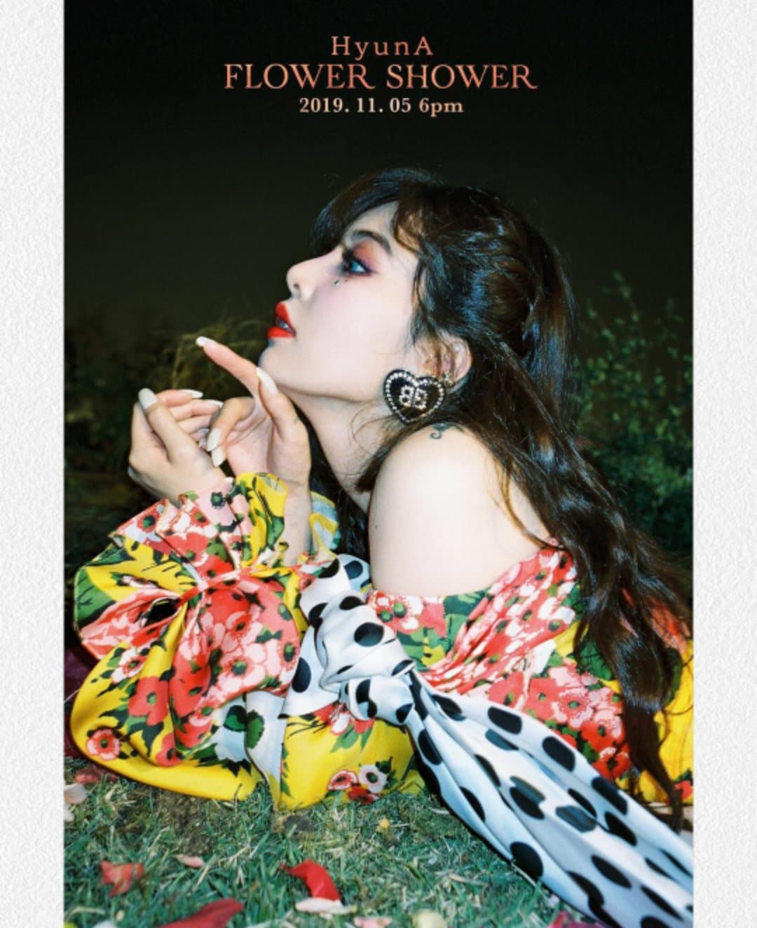Mới đây, nhà sáng tạo PNATION - PSY đã chính thức tung ra những hình ảnh đầu tiên trong dự án comeback của “gà cưng” HyunA vào ngày 5/11. Bên cạnh đó, concept và tên ca khúc trong dự án lần này cũng đã được công bố khiến người hâm mộ của HyunA không khỏi thích thú. Theo đó, ca khúc comeback của HyunA sẽ có tên Flower Shower và sẽ được “thả xích” vào lúc 6h chiều ngày 5/11 (Giờ Hàn Quốc).
