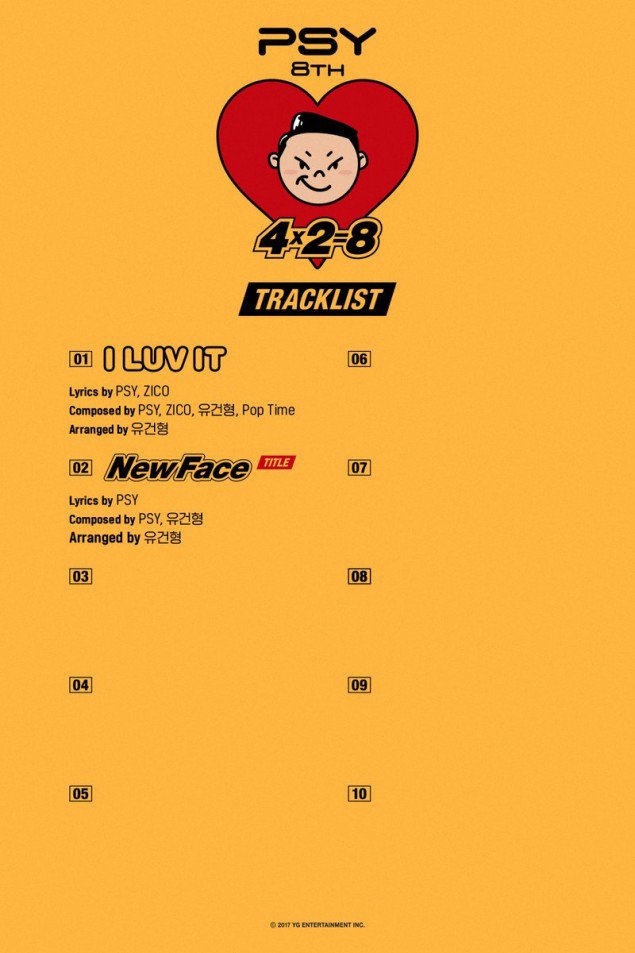 PSY vừa tiếp tục bật mí về album mới nhất. Cụ thể, đĩa nhạc thứ 8 trong sự nghiệp của “chàng mập nhà YG” sẽ có tên gọi 4×2=8. Ca khúc chủ đề của album là NewFace được PSY cùng Yoo Gun Hyung sáng tác. 1 bài hát nữa cũng được hé lộ đó là I Luv It - đồng sáng tác của PSY, Zico, Yoo Gun Hyung và Pop Time.