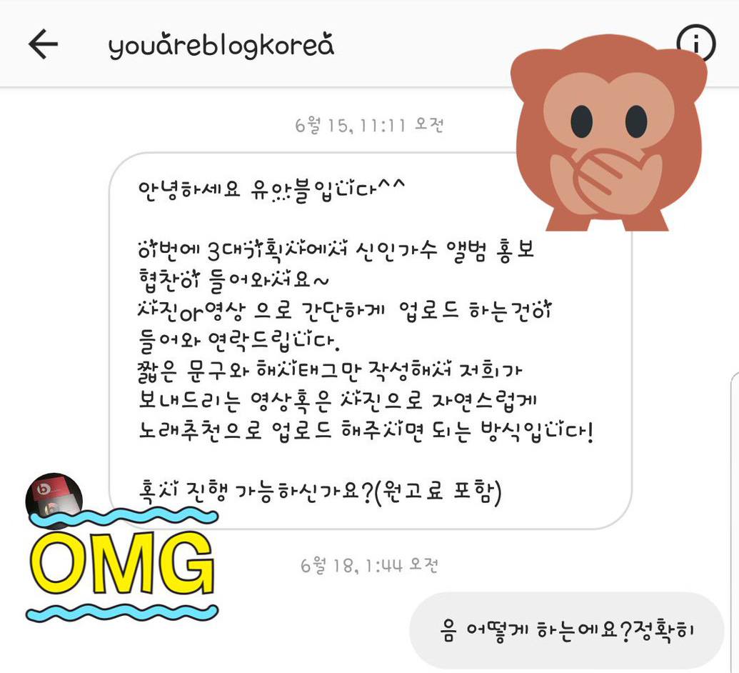 Nội dung lời đề nghị YABK gửi đến các hot teen: “Xin chào, đây là Youabl (viết tắt của You Are Blog Korea). Chúng tôi vừa nhận được một lời đề nghị quảng cáo album mới cho một nhóm nhạc tân binh thuộc Big 3. Phía họ đề nghị up hình hoặc video nên chúng tôi đã tìm đến bạn. Tất cả những gì bạn cần làm chỉ là up hình hoặc video chúng tôi gửi cùng với dòng chia sẻ và hashtag sao cho thật tự nhiên! Bạn có hứng thú không? (Bài có trả phí)