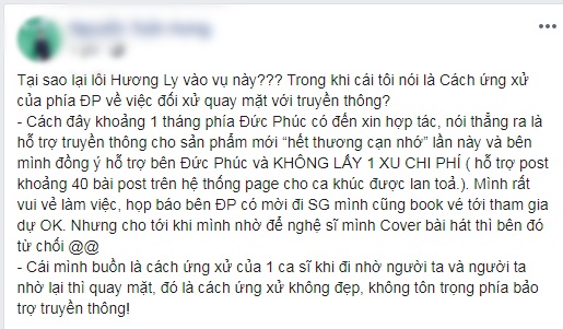 Chỉ mới đây, ngay sau khi Đức Phúc bị phía Hương Ly chỉ trích, tố vô ơn, quản lý của nam ca sĩ đã đăng đàn để giải thích mọi chuyện. Tuy nhiên, những tưởng sự việc sẽ lắng xuống thì chỉ cách đây ít giờ, giám đốc của đối tác truyền thông trong sản phẩm Hết thương cạn nhớ và cũng là quản lý của Hương Ly tiếp tục đưa ra những quan điểm gây xôn xao mạng xã hội.