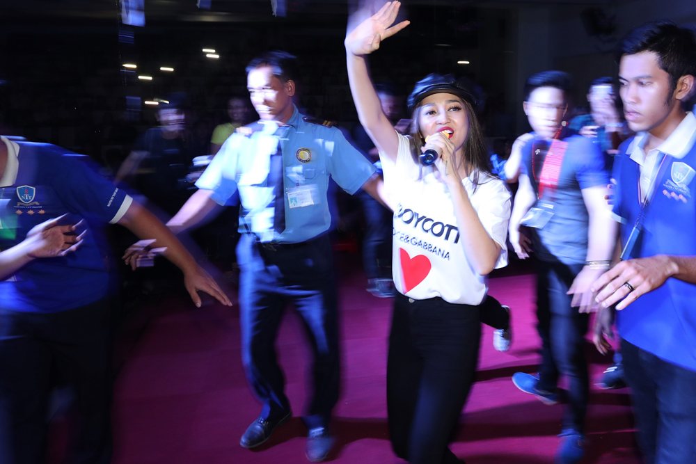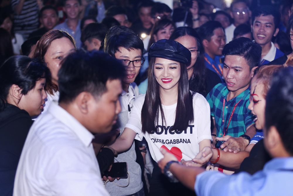 Hoàn thành phần biểu diễn, nữ ca sĩ khá vất vả để có thể di chuyển trong vòng vây người hâm mộ.