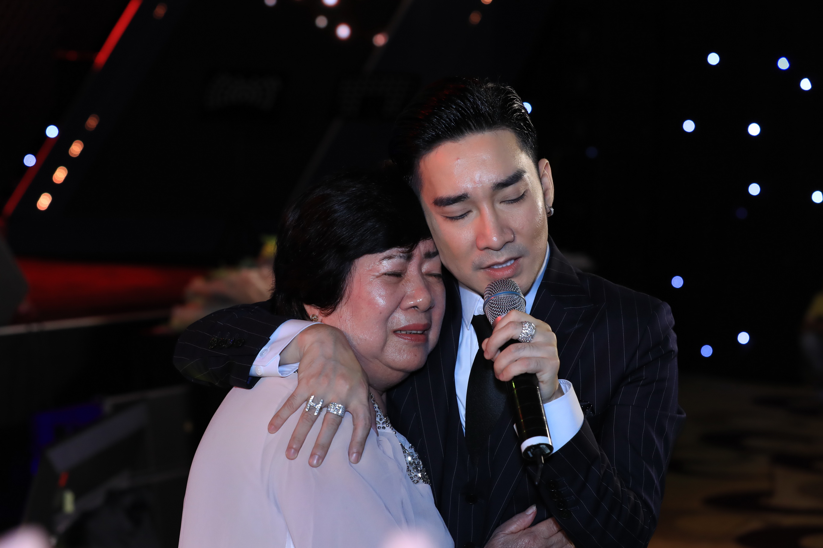 Trong một ca khúc về mẹ, mẹ Quang Hà đã lên sân khấu tặng hoa cho con trai, cả hai đã rơi nước mắt khiến khán giả vô cùng xúc động trước mẫu tử thiêng liêng này.
