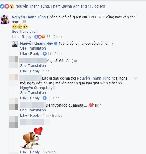 Và mới đây nhất, chính ông bầu cũ đã lên tiếng nói về Lạc trôi ngay trên mạng xã hội giúp xoá tan tin đồn không hay nhiều ngày qua. Cụ thể trong một bình luận của nam ca sĩ trên trang facebook người bạn, Quang Huy đã góp vui bằng một dòng trả lời khá hài hước và đầy ẩn ý: “17 triệu là số lẻ mà, đợi số chẵn đi”. Động thái trên quá đủ để chứng minh tuy đã “rời xa vòng tay” của nhau, người đàn anh này vẫn luôn dành sự quan tâm, ủng hộ thầm lặng cho Sơn Tùng.
