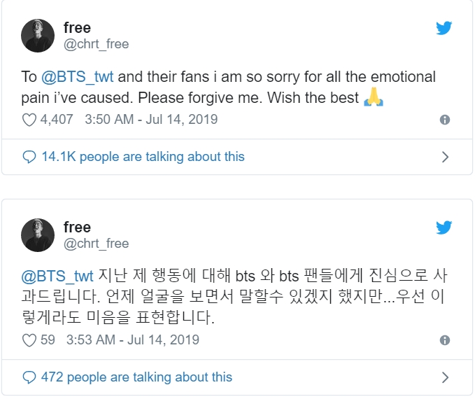 Mới đây, nam rapper B-Free chia sẻ một lời nhắn trên trang twitter của mình với nội dung:“Gửi tới BTS và các fan của họ, tôi rất xin lỗi vì những nỗi đau mà tôi đã gây ra cho các bạn. Xin hãy tha thứ cho tôi. Mong ước những điều tốt đẹp nhất sẽ đến”. Bên cạnh đó, anh chàng tiếp tục nhắc tới BTS trong một bài đăng riêng viết bằng tiếng Hàn:“Tôi vô cùng xin lỗi các fan BTS vì những hành động trong quá khứ của tôi. Tôi luôn nghĩ rằng một ngày nào đó có thể trực tiếp nói ra điều này. Nhưng bây giờ, tôi sẽ bày tỏ suy nghĩ của mình tại đây”.