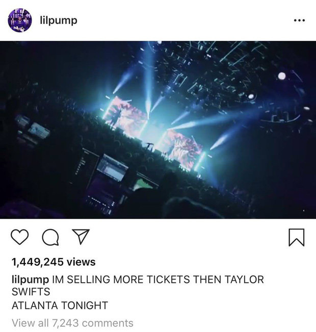 Tiêu biểu trong số đó phải kể đến lần Lil Pump nhận “một rổ gạch đá” từ phía cộng đồng mạng khi dám cả gan … “cà khịa” đàn chị Taylor Swift khi mạnh miệng tuyên bố concert của anh bán ra nhiều vé hơn cả “rắn chúa” trên Instagram. Tuy nhiên, xấu hổ thay, sau đó khán giả phát hiện concert trong bức ảnh của anh ta chỉ diễn ra tại một nhà hát với sức chứa tối đa 3.600 người cũng như doanh thu chỉ bằng con số lẻ Reputation Stadium Tour của Taylor.