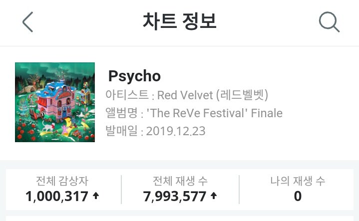 Unique Listeners là số lượng người nghe độc lập, mỗi một tài khoản chỉ được tính là một lượt nghe dù cho bài hát có được bật đi bật lại bao nhiêu lần đi chăng nữa. Việc đạt 1 triệu lượt UL chỉ trong vòng 7 ngày ra mắt đã chứng minh Psycho cực kỳ thành công trong việc chinh phục những khán giả khó tính nhất. Mặc dù đang gặp một số khó khăn trong quá trình quảng bá vì Wendy vừa bị té ngã nghiêm trọng ở SBS Gayo Daejeon 2019, nhưng chắc chắn những thành tích của Psycho cũng phần nào giúp các cô gái và người hâm mộ cảm thấy vui hơn. Không chỉ ở Genie, trên nền tảng phát nhạc trực tuyến hàng đầu Hàn Quốc là MelOn, Red Velvet cũng là nhóm nhạc nữ đạt được 100.000 lượt yêu thích nhanh nhất.