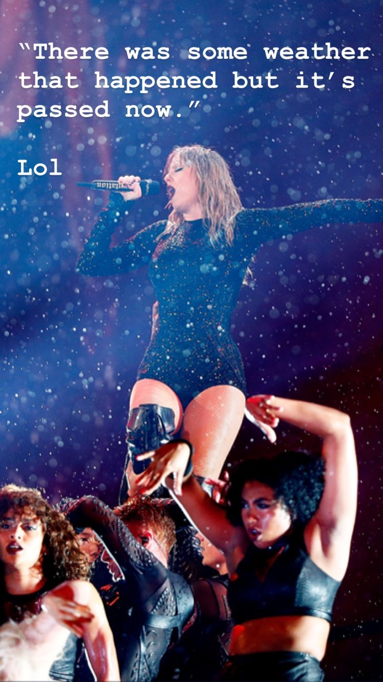 Những hình ảnh trên đều được Taylor Swift đăng lên trên story Instagram. Cô dường như rất vui với việc được đến Sydney, Úc để cùng chung vui với các fan hâm mộ ở xa. Được biết, đây không phải lần đầu tiên Taylor Swift chịu chơi hết mình như vậy dưới cơn mưa, 1 đêm diễn khác cũng mưa tầm tã thế này là tại sân vận động MetLife, New Jersey - show diễn thứ 2 trên lịch trình của Reputation Stadium Tour. Lần đấy, “nàng rắn” nhà ta đã mặc thời tiết mà diễn đến tận 2 tiếng dưới cơn mưa. Có ai yêu fan như cô này đâu chứ, phải không nào?