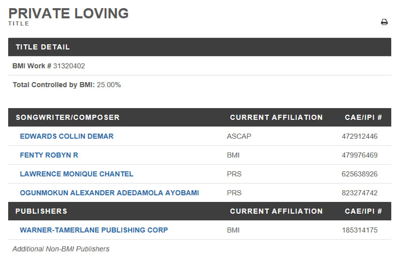 Mới đây, cộng đồng người yêu nhạc US-UK đang truyền tay nhau một bức ảnh với tốc độ chóng mặt, được cho là bằng chứng về màn comeback của Rihanna. Cụ thể, nhiều người đã phát hiện ra trên hệ thống BMI, Rihanna vừa đăng ký một ca khúc mới có tên Private Loving, tuy nhiên nữ ca sĩ lại sử dụng tên thật của mình trong phần credit. Bức ảnh đã được nhiều trang nhạc uy tín trên thế giới đăng tải nên khả năng cao đây không phải là… tin vịt.